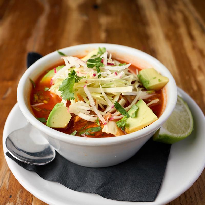 Braised pork, hominy, onions, chile de arbol, cabbage, radish, avocado, cotija, cilantro, lime.