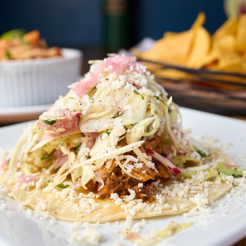 Cochinita pibil marinated in an achiote rub, cilantro, black pepper, cabbage, pickled onion slaw, cotija.